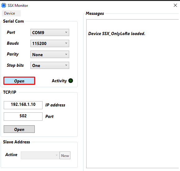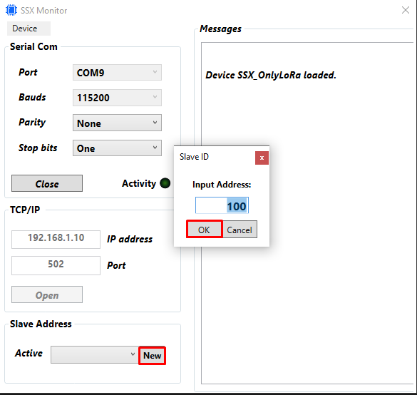 3. Una vez hemos abierto el puerto, clicamos en el apartado Slave Address, la opción New y abrirá una ventana con el Input Address que siempre es 100, en caso de que la conexión sea mediante el protocolo LoRa. En caso de que el protocolo sea RS485, el Input Address será dependiendo de cada SSX. Continuamos haciendo clic en OK.