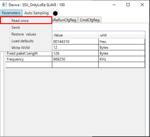 4. Se abrirá una ventana nueva dónde no tenemos valores de forma automática, para poder visualizar los valores hay que ir a la opción Parameters y seleccionar la opción Read Once. Una vez seleccionado la opción cargará los valores de la electrónica y el semáforo que se encuentra de color negro a la derecha de Auto Sampling hará un destello verde conforme la conexión se ha realizado correctamente. En caso contrario aparecerá un destello rojo.