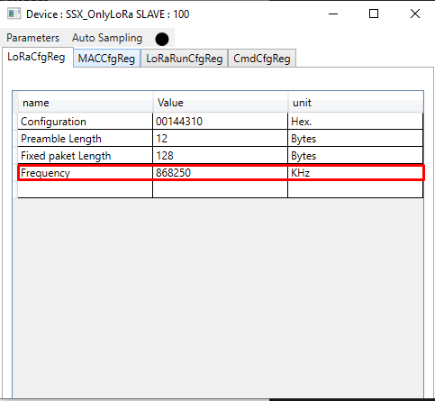 5. En el apartado LoRaCfgReg que significa "Lora configuration registers" aparecen los valores de la configuración y la frecuencia LoRa que contiene la electrónica en el momento de la conexión.