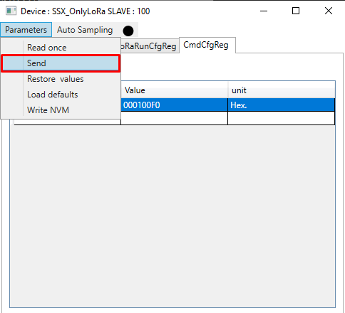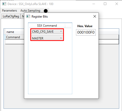 7. El apartado CMDCfgReg que significa "CMD configuration registers", sirve para enviar diversas solicitudes a la SSX. Para hacer eso debemos hacer doble click izquierdo a la derecha de Command y se nos abrirá una ventana donde podremos seleccionar las distintas solicitudes. La más importante en este caso es la de CMD_CFG_SAVE, que sirve para guardar los cambios que hemos realizado.