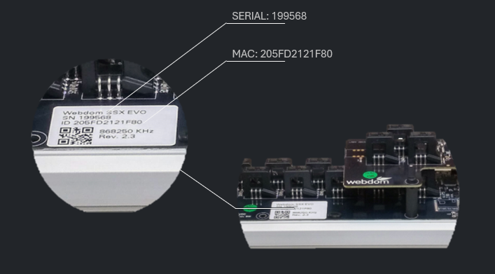 La dirección MAC es un código de 12 carácteres que permite identificar de forma unívoca cada una de las tarjetas electrónicas Webdom SSX. Esta dirección debe ser configurada en el Webdom Lora Gateway para que pueda establecer un enlace de comunicación. Esta dirección se encuentra junto con el número de serie del producto, en una etiqueta ubicada visible en la parte frontal del circuito electrónico: